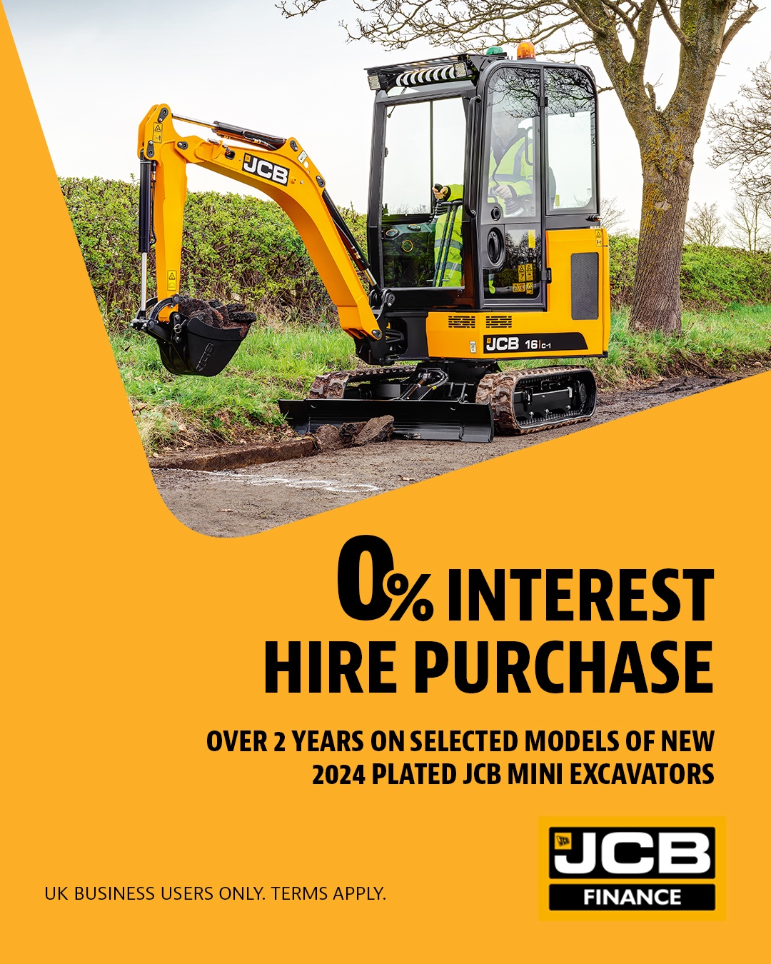 0% Interest Hire Purchase over 2 years on selected models of new 2024 plated JCB Mini Excavators